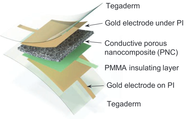 Highly sensitive capacitive pressure sensors over a wide pressure range enabled by the hybrid responses of a highly porous nanocompositeKyoung-Ho Ha, Weiyi Zhang, Hongwoo Jang, and 5 more authorsAdvanced Materials 2021Past research aimed at increasing the sensitivity of capacitive pressure sensors has mostly focused on developing dielectric layers with surface/porous structures or higher dielectric constants. However, such strategies have only been effective in improving sensitivities at low pressure ranges (e.g., up to 3 kPa). To overcome this well-known obstacle, herein, a flexible hybrid-response pressure sensor (HRPS) composed of an electrically conductive porous nanocomposite (PNC) laminated with an ultrathin dielectric layer is devised. Using a nickel foam template, the PNC is fabricated with carbon nanotubes (CNTs)-doped Ecoflex to be 86% porous and electrically conductive. The PNC exhibits hybrid piezoresistive and piezocapacitive responses, resulting in significantly enhanced sensitivities (i.e., more than 400%) over wide pressure ranges, from 3.13 kPaâ1 within 0â1 kPa to 0.43 kPaâ1 within 30â50 kPa. The effect of the hybrid responses is differentiated from the effect of porosity or high dielectric constants by comparing the HRPS with its purely piezocapacitive counterparts. Fundamental understanding of the HRPS and the prediction of optimal CNT doping are achieved through simplified analytical models. The HRPS is able to measure pressures from as subtle as the temporal arterial pulse to as large as footsteps.